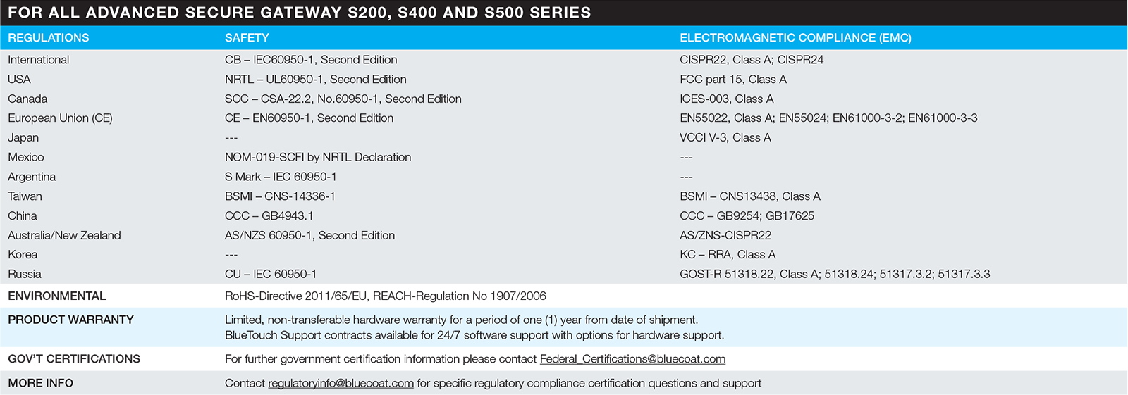 Built on the same architecture and hardware base as the ProxySG, which is trusted by many of the world’s largest organizations, the Advanced Secure Gateway delivers unmatched performance and reliability in the Secure Web Gateway space. Blue Coat’s appliances are purpose built, with a custom operating system designed for security. The solution offers features, such as redundant hot swappable power supplies and disks, along with dual redundant boot devices, redundant fan architecture, fail-to-wire network ports, and automatic power supply failover to maximize up-time and availability.